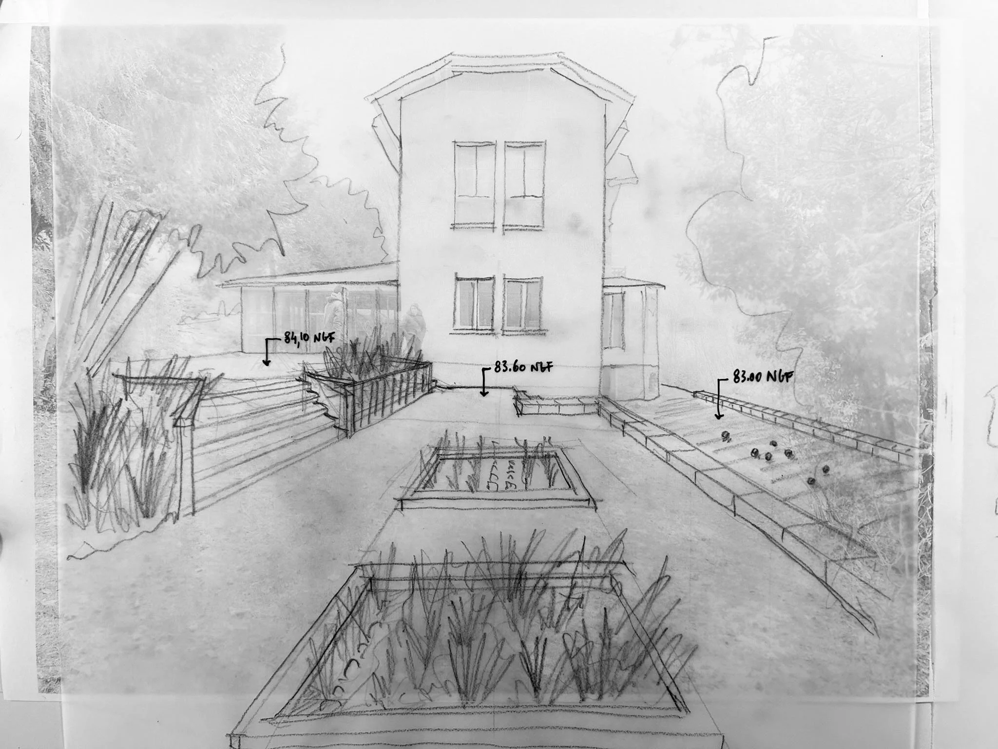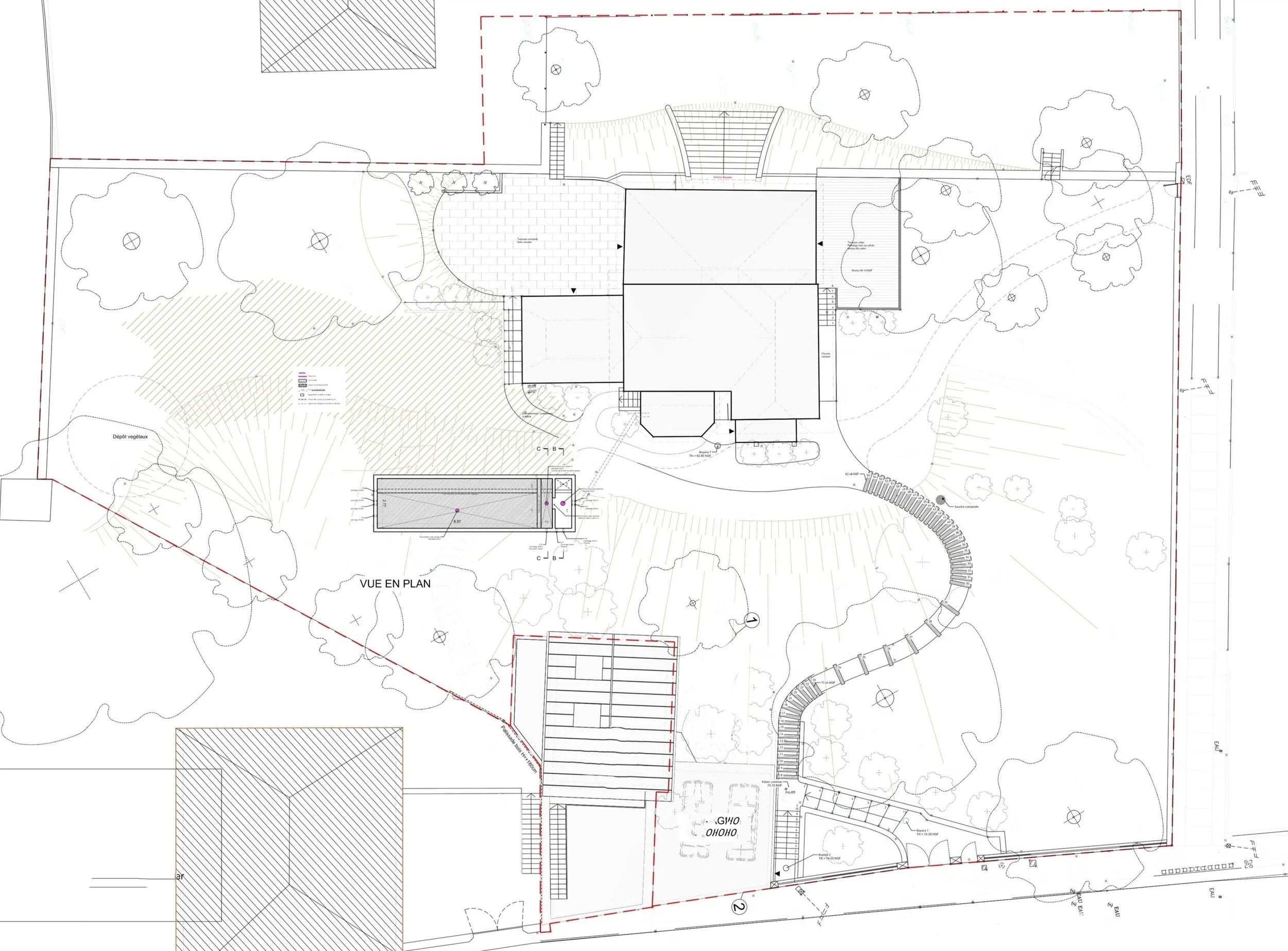 Constructions annexes autour d’une maison du XIXe sur un terrain à forte pente. Creation d’un garage semi-enterré, création d’un nouveau cheminement piéton, construction d’une piscine.