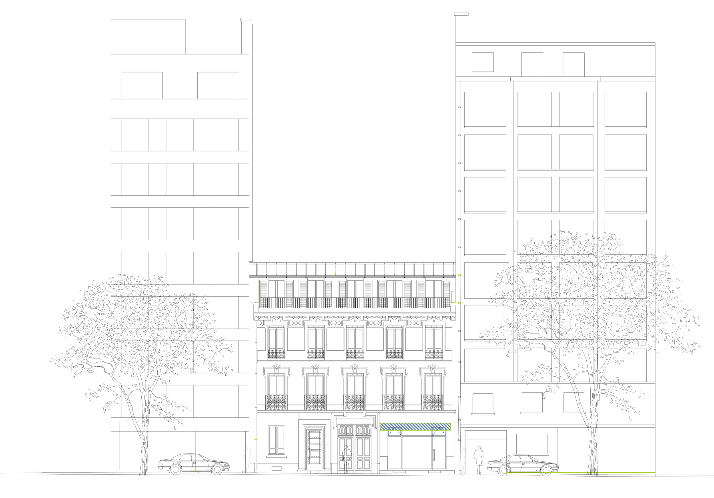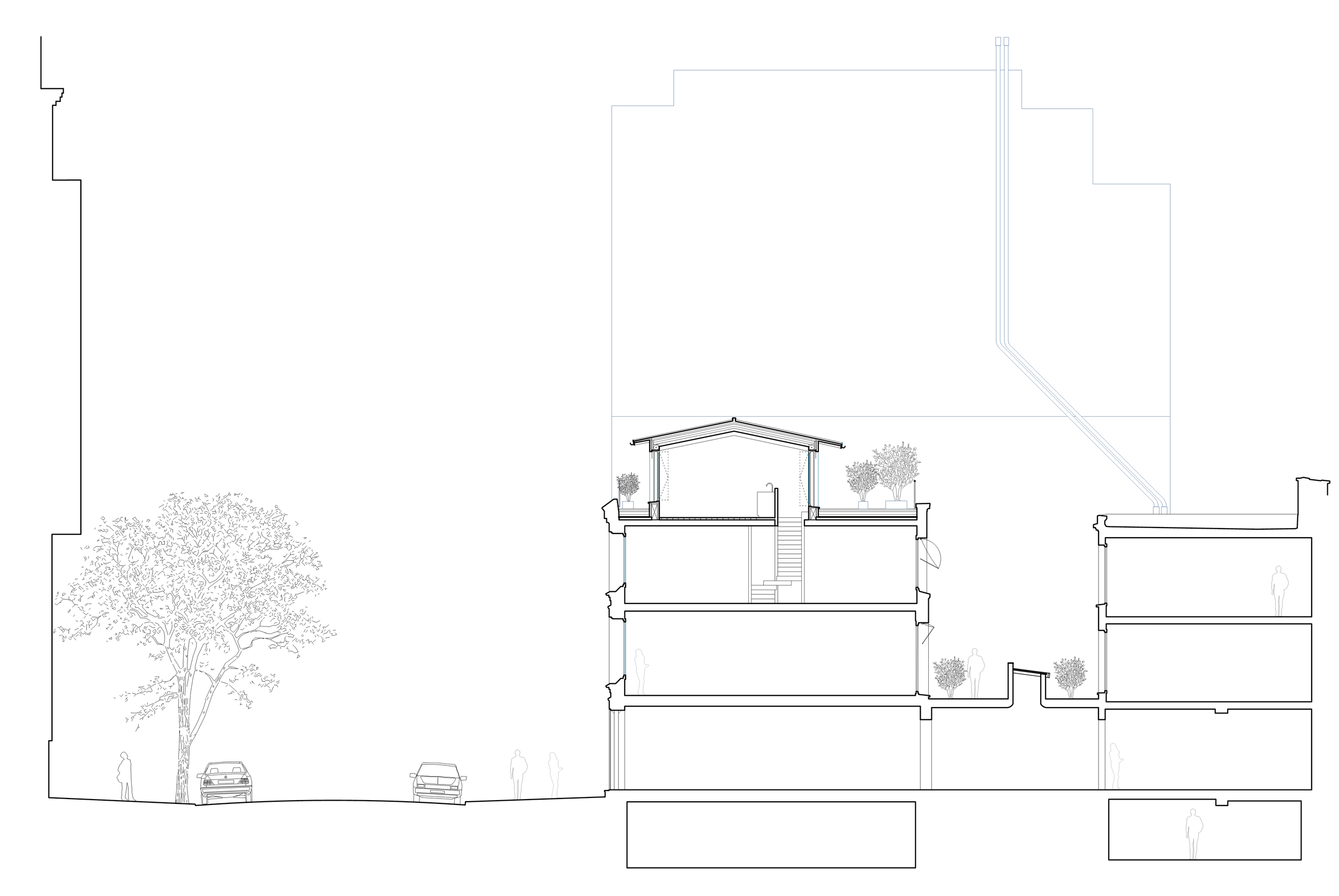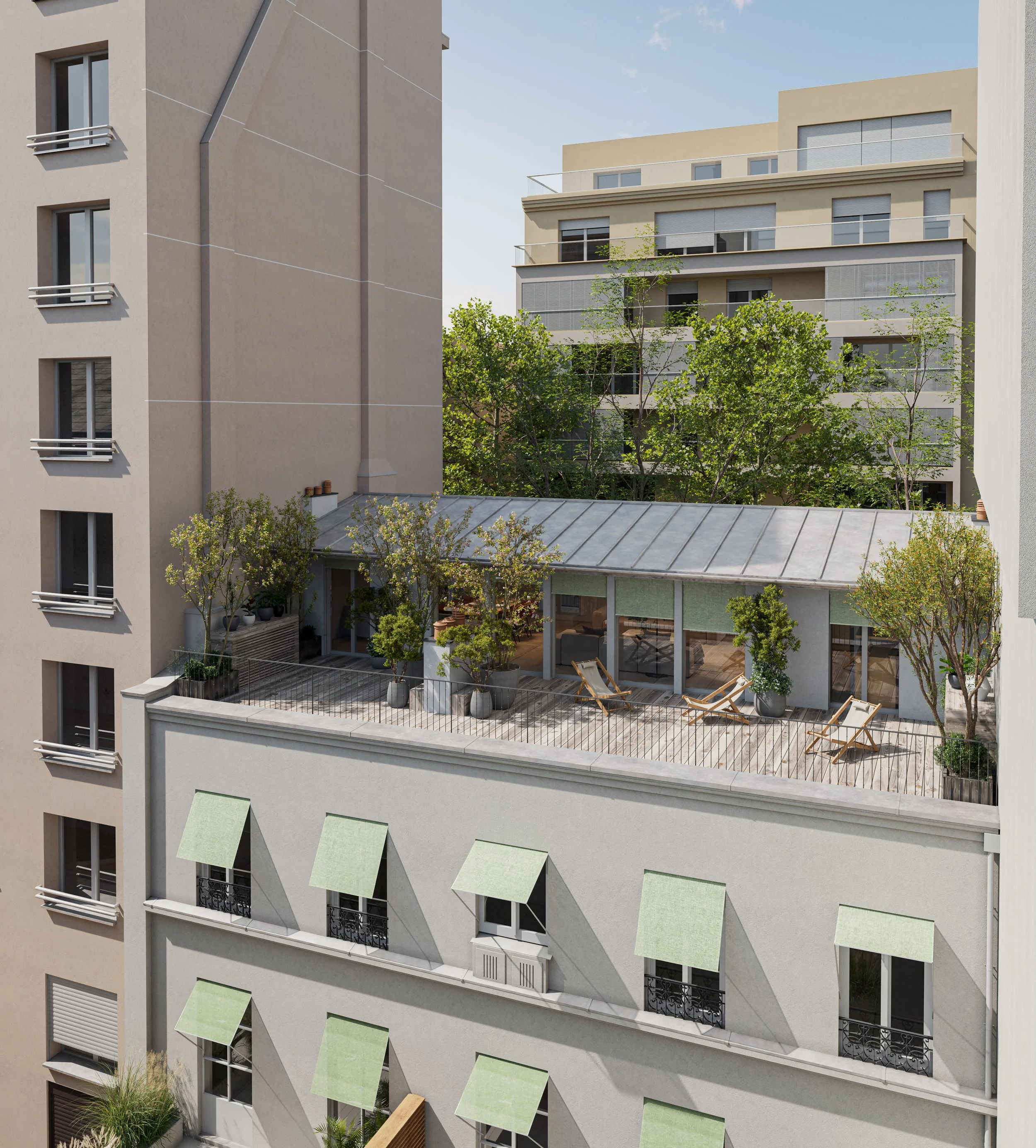 Surélévation d’un immeuble de logements à Paris XVIIe rue Guy Môquet. Création d’un étage supplémentaire en structure bois et matériaux biosourcés, aménagement d’un jardin en toiture. Rénovation complète du logement en duplex.