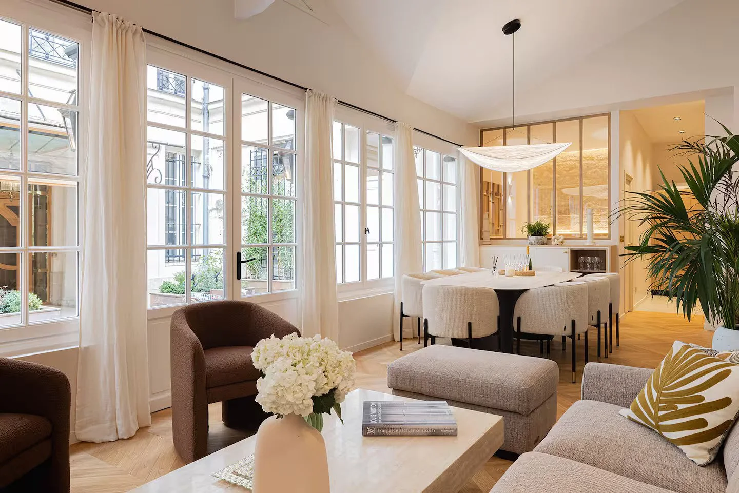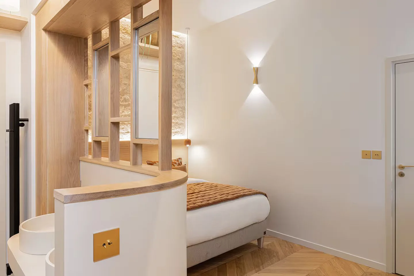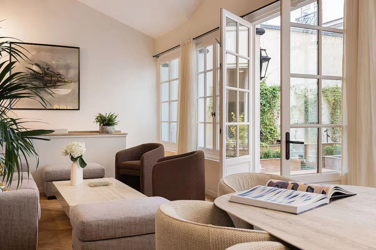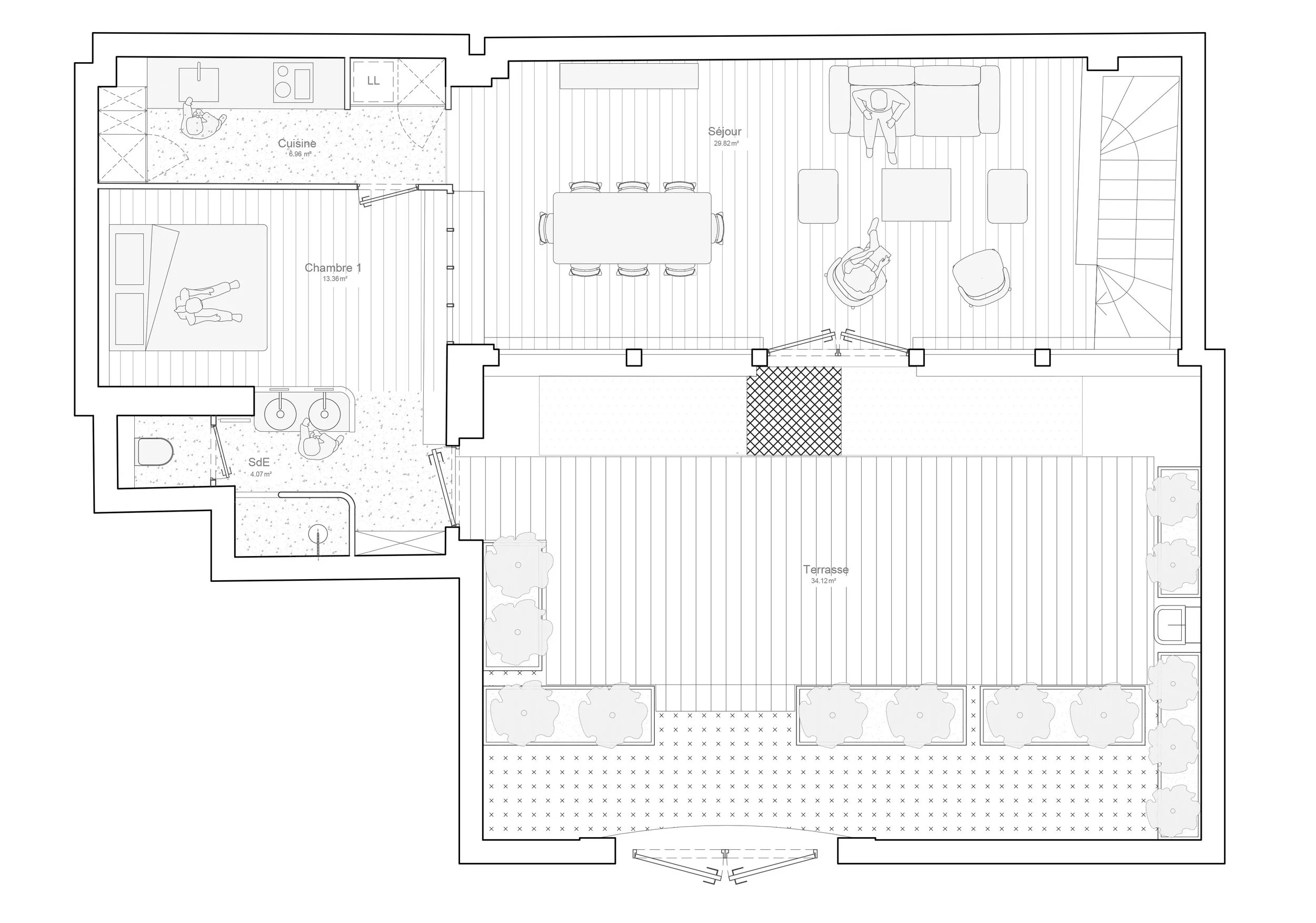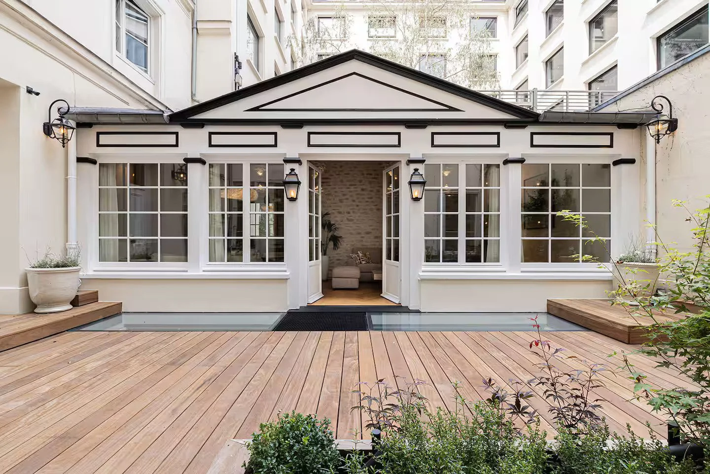 Transformation lourde d’un local commercial sur cour en logement en duplex. Création de puits de lumière, aménagement intérieur et extérieur.